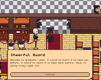 - Sometimes when interacting with the graduate picture in the main hall the continue button disappears. Unfortunately you'll have to go back to main menu and start again (but you will keep your facts)